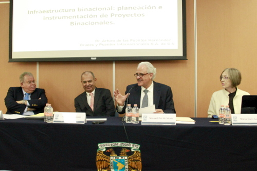 Como parte de la conferencia “Infraestructura binacional: planeación e instrumentación de Proyectos Binacionales”, impartida por el doctor de las Fuentes y moderada por Manuel Perló, Director del Instituto de Investigaciones Sociales de la UNAM, el académico puntualizó que la instrumentación de un proyecto de infraestructura binacional requiere la construcción de acuerdos entre ambos lados de la frontera, proceso complejo que puede durar 15 años.